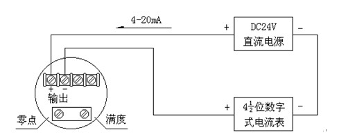 2.校驗:以二線制0-8%硫酸濃度變送器為例,按圖四接線。